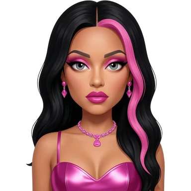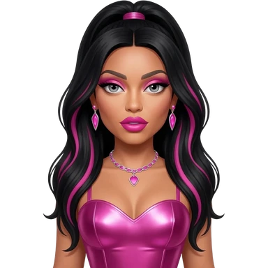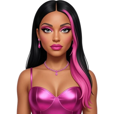 Nicki Minaj with grey eyes, long black hair with pink highlights, pink eyeshadow, hot pink lipstick, hot pink metallic sweetheart dress, pink necklace and earrings emoji