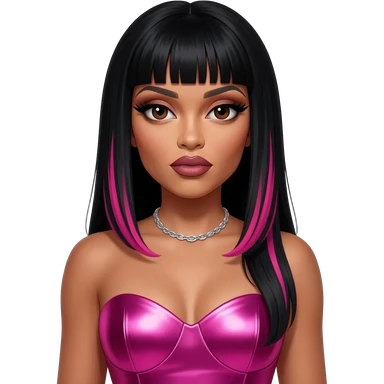 Nicki Minaj with dark brown eyes, long black hair with pink highlights, hot pink metallic sweetheart dress, silver necklace emoji