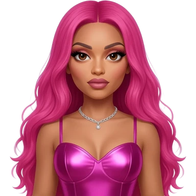 Nicki Minaj with dark brown eyes, long hot pink hair, hot pink metallic sweetheart dress, silver necklace emoji