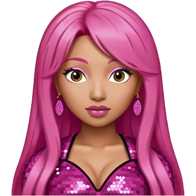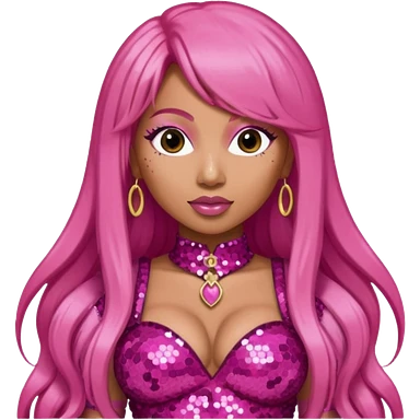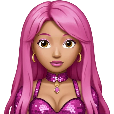 Nicki Minaj with long pink hair, dark pink sequin outfit emoji
