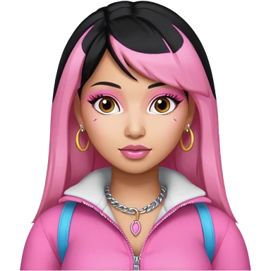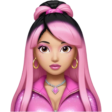 Nicki Minaj black hair with pink highlights, pink outfit emoji