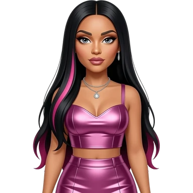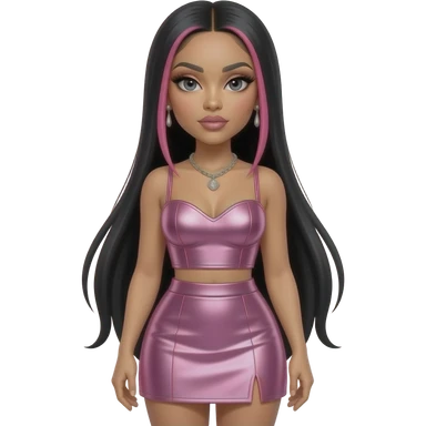 Nicki Minaj with dark grey eyes, long black straight hair with pink highlights, pink metallic sleeveless sweetheart crop top, pink metallic mini skirt, necklace and earrings emoji