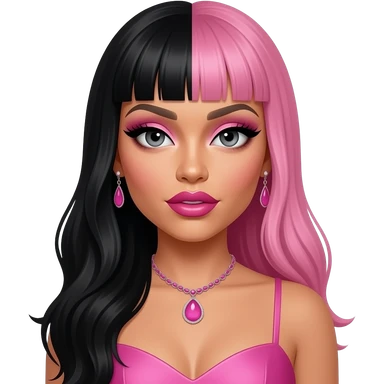 Nicki Minaj with dark grey eyes, long black and pink hair with bang, pink eyeshadow, hot pink lipstick, pink dress, pink necklace and earrings emoji