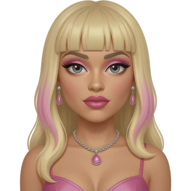 Nicki Minaj with dark grey eyes, long blonde and pink hair with bang, pink eyeshadow, hot pink lipstick, pink dress, pink necklace and earrings emoji