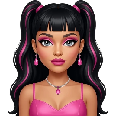 Nicki Minaj with grey eyes, long black hair with pink highlights, pink eyeshadow, hot pink lipstick, hot pink metallic sweetheart dress, pink necklace and earrings emoji