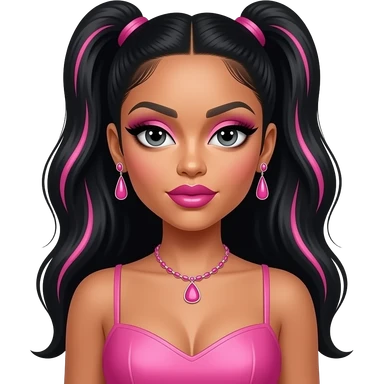 Nicki Minaj with dark grey eyes, long black hair with pink highlights, pink eyeshadow, hot pink lipstick, pink dress, pink necklace and earrings emoji