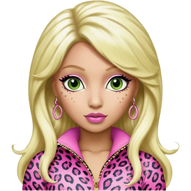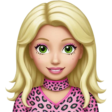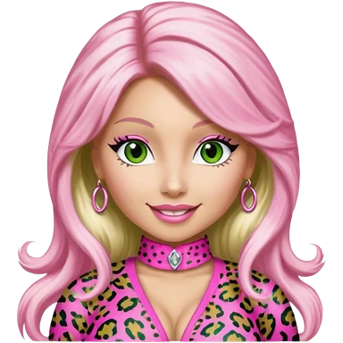 Smiling Green eyed white skin Nicki Minaj wearing a pink leopard print outfit with hair that is half blonde and half pink emoji