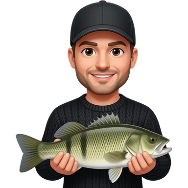 an adult with a black sweater and black baseball hat holding a bass fish emoji