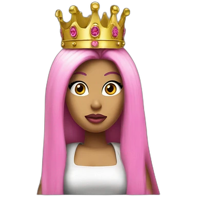 Nicki Minaj with a long straight pink bob and bangs and a diamond chain that says “queen”. She he’s a crown on her head emoji