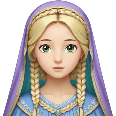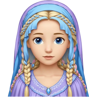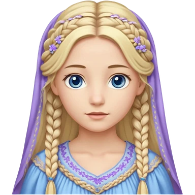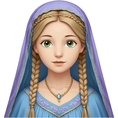 Joven de unos 20 años, de aspecto dulce y elegante. Piel clara, ojos expresivos (pueden ser azules o verdes) Rubio o castaño claro, largo, con trenzas o velo. Vestido largo de tonos suaves (blanco, azul o lavanda), con bordados dorados; un manto o toca fina cubriendo la cabeza. emoji