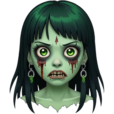 Faça uma menina de cabelo liso preto com franja zumbi cabelo longo 🧟♀️ faça ela assim faça ela verde com cara mais assustadora emoji