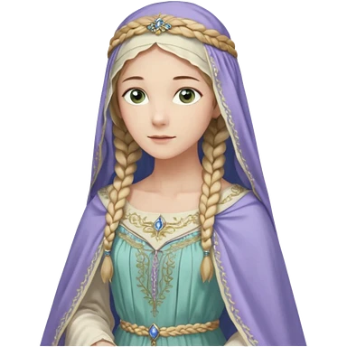 Joven de unos 20 años, de aspecto dulce y elegante. Piel clara, ojos (pueden ser azules o verdes) Rubio o castaño claro, largo, con trenzas o velo. Vestido largo de tonos suaves (blanco, azul o lavanda), con bordados dorados; un manto o toca fina cubriendo la cabeza. se vea todo el cuerpo emoji