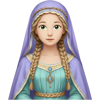 Joven de unos 30 años, de aspecto dulce y elegante. Piel clara, ojos (pueden ser azules o verdes) Rubio o castaño claro, largo, con trenzas o velo. Vestido largo de tonos suaves (blanco, azul o lavanda), con bordados dorados; un manto o toca fina cubriendo la cabeza. Que se vea todo el cuerpo emoji