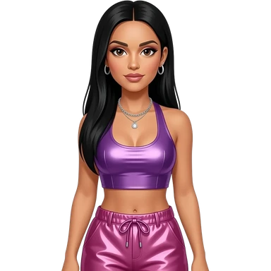 Nicole Scherzinger with dark brown eyes, long black straight hair, purple metallic halter crop top, pink metallic baggy pants, necklace and earrings emoji