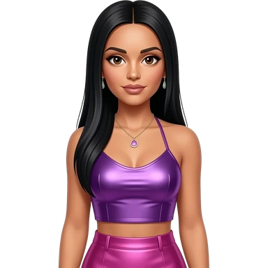 Nicole Scherzinger with dark brown eyes, long black straight hair, purple metallic halter crop top, pink metallic skirt, necklace and earrings emoji