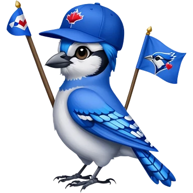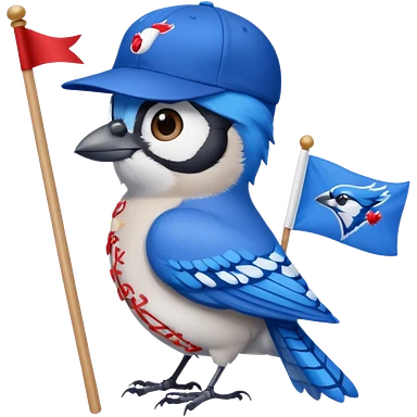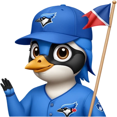 blue jay with MLB blue jay baseball hat, holding flag saying Hi Carolyn emoji