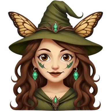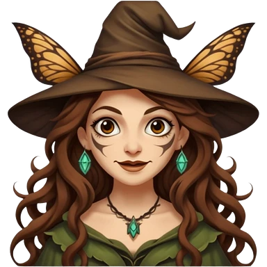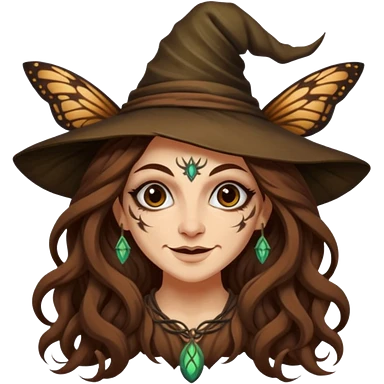 night witch woman long wavy brown hair tattoos spinning moth from fingers emoji | AI Emoji Generator