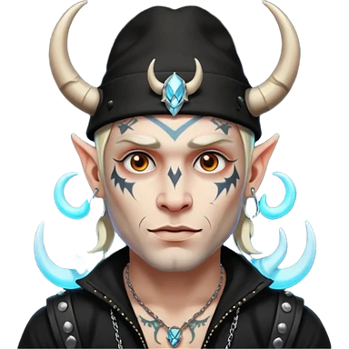 white skin Rock-style man — piercings, glowing tattoos on face, black hat with horns emoji