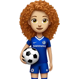 ginger curly hair girl with blue eyes, with football and red and black nike football boots with a football in hand, while wearing a chelsea kit emoji