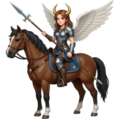 valkiria en caballo, alas en la cabeza, lanza, cabello café, cuerpo completo emoji