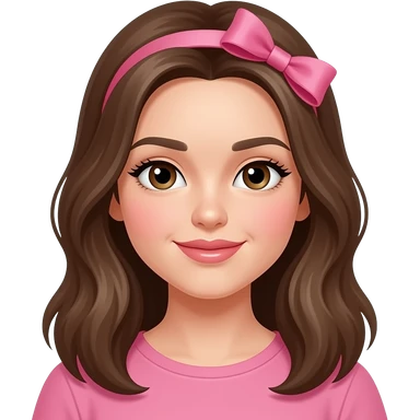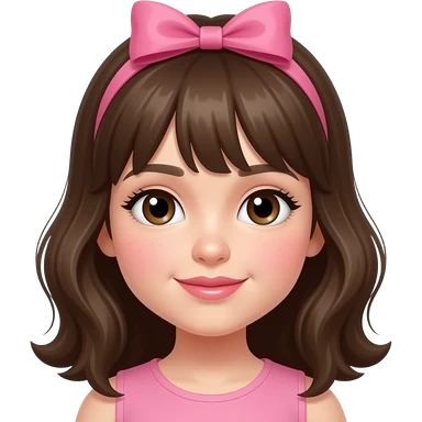 Niña de pelo castaño con lazo rosa blanca de piel ojos marrones colorete en las mejillas y glos en los labios y que arriba en rosa emoji