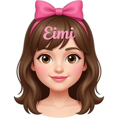 Niña de pelo castaño con lazo rosa blanca de piel ojos marrones colorete en las mejillas y glos en los labios y que arriba en rosa pongq Eimi con un lazo coquete pero que Eimi lo ponga separado de la niña y con estilo reas emoji | AI Emoji Generator