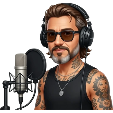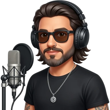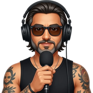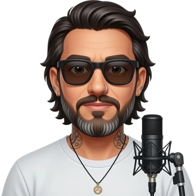 The handsome manly Latino podcast host with medium length hair, a long slightly graying beard and tattoos with his ears pierced and a nose ring on the right side, dark brown eyes, dark sunglasses, recording an episode emoji
