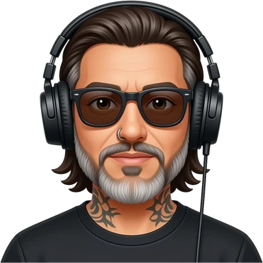 The handsome manly Latino podcast host with medium length hair, a long slightly graying beard and tattoos with his ears pierced and a nose ring on the right side, dark brown eyes, dark sunglasses, headphones, recording an episode emoji