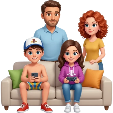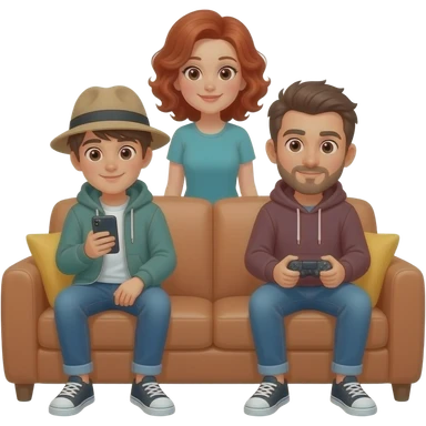 UN ADOLESCENTE CON UN CELULAR SENTADO EN UN SILLÓN USANDO GORRA Y VISTIENDO UN BUZO, OTRA ADOLESCENTE SENTADA EN EL SILLON JUGANDO A LA PLAY CON ROBA HOODIE. PADRE DE PELO CASTAÑO PÍEL MORENA Y MADRE COLORADA DE CABELLO RIZADO MIRANDO DESDE ATRAS DEL SILLÓN. emoji