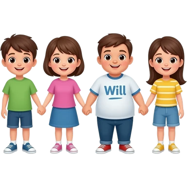 hazme 4 niños que se le vean todo el cuerpo cogidos de la mano i que un niño este gordo i que en su camiseta ponga Will emoji