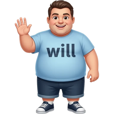 hazme un niño gordo que se le vea todo el cuerpo i este contento i que este de espaldas caminado para alante que en la camiseta ponga Will en letras emoji