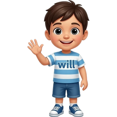 hazme un niño gordo que se le vea todo el cuerpo i este contento i que este de espaldas caminado para atras que en la camiseta ponga Will en letras emoji