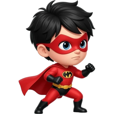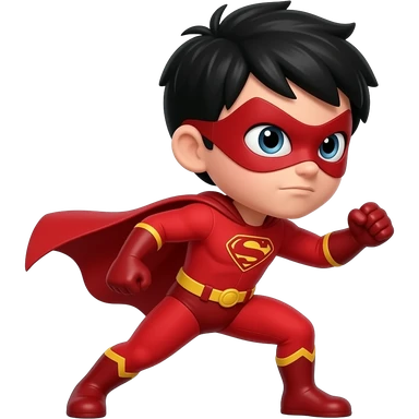 quiero que me hagas a un superheroe con el pelo negro mascara roja i con un traje rojo que sea un niño peleando mirando para la derecha emoji