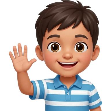 Un niño con el pelo rizado y moreno, con los ojos verdes y una sonrisa que le falta un diente tiene varias pecas por la cara y va vestido con un peto vaquero y una camiseta por dentro del peto, de color blanca. emoji