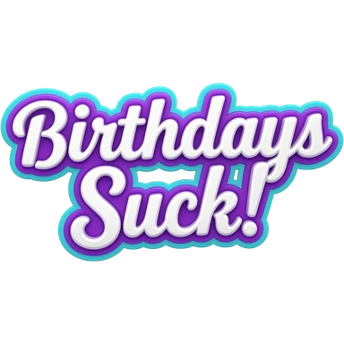 the words "Birthdays Suck!" in bright white girly typography 3D style lettering, with bold neon purple and turquoise color border around the typography letters, must appear 3D no background, high definition, 600 dpi, must be no emoji faces, no emoji icons, and no human figures emoji