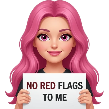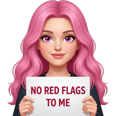 sexy girl with long pink hair and pink eyes wearing a holding a NO RED FLAGS TO ME sign emoji