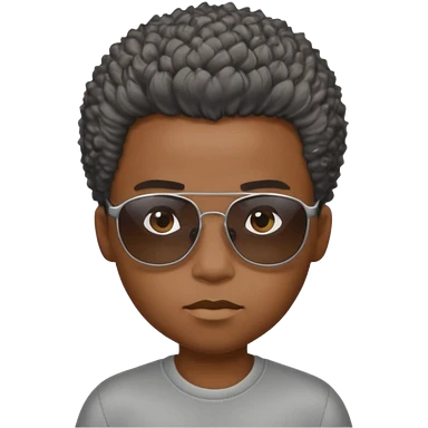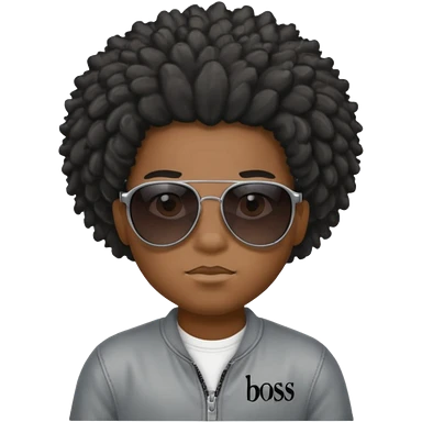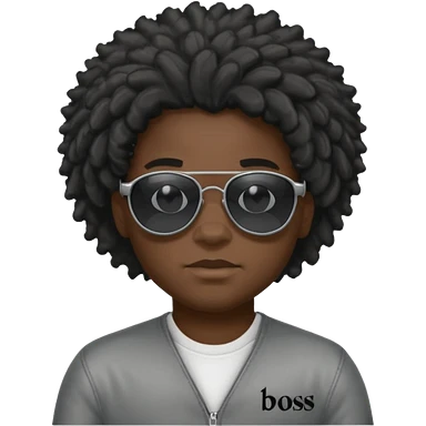 Un garçon,de couleur noir avec des lunettes de soleil grise,il a des cheveux crépus et au dessus de sa tete il est écrit BOUSS emoji