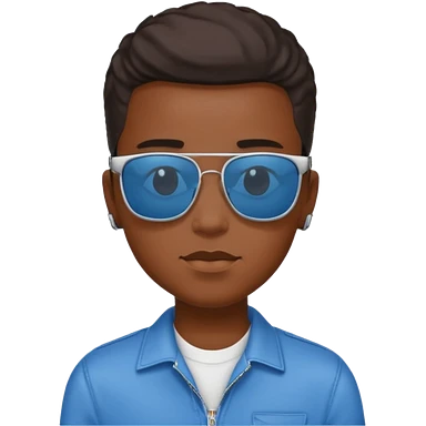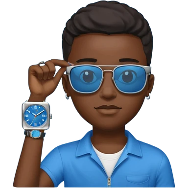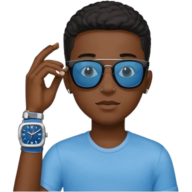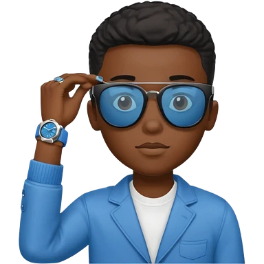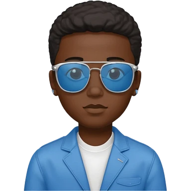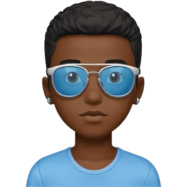 Un garçon noir avec des lunettes de soleil un peu bleu avec un cadran plutôt carré et SANS QU’ON VOIT SES YEUX. Et au dessus de sa tête il y a écrit BOUSS emoji