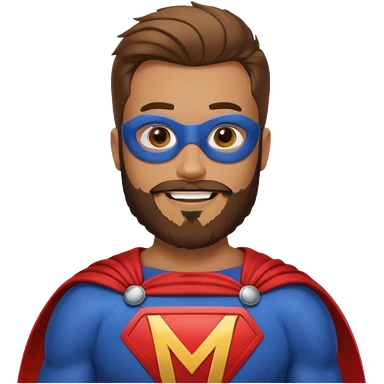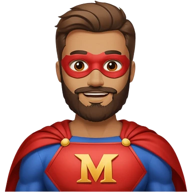 бородатый мужчина в костюме супер героя с буквой М на груди emoji
