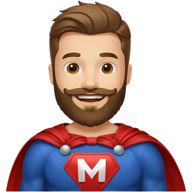 бородатый мужчина в костюме супер героя с буквой М на груди веселится emoji