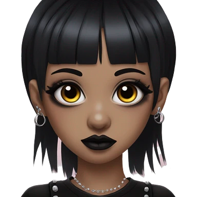 goth woman with black hair and baby bangs with septum piercing and both sides of nose pierced with hazel eyes and no eyebrows with dramatic goth makeup emoji