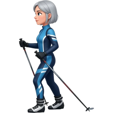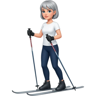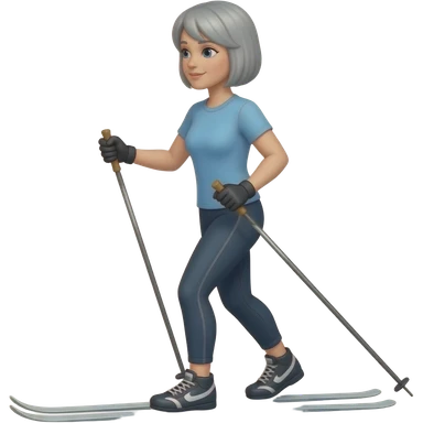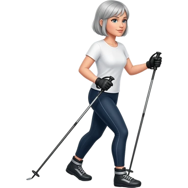 simple emoji, woman with grey bob haircut nordic walking, pole in each hand, hole body view side view, no skis, wearing white t-shirt and navy leggings emoji