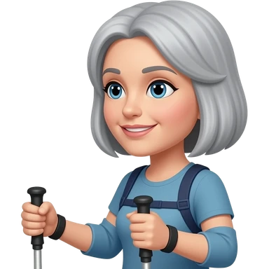 woman with grey bob haircut nordic walking, pole in each hand, hole body view side view emoji