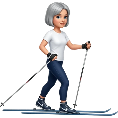 more simple emoji, woman with grey bob haircut nordic walking, pole in each hand, whole body view side view, "NO SKIS", wearing white t-shirt and navy leggings emoji
