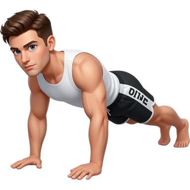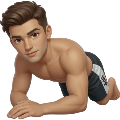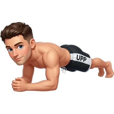 guy with brown hair with white white and black shorts that say "UPP" in white on the side forearms / !!!elbows touching the ground!!). Forearms on the ground not in air and legs straight out as if in plank position emoji