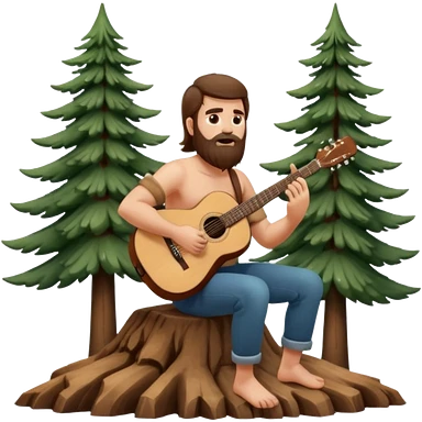 nude from behind character, bearded man with long brown hair playing acoustic guitar by pine trees emoji