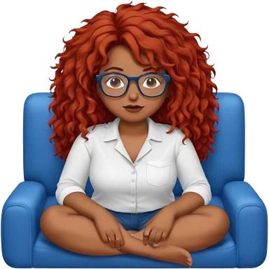 Nude white curvy woman with classes with glasses brown redy long frizzy messy hair sat on blue sofa. emoji