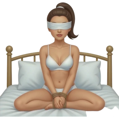 woman in blinfold with white underwear with ponytail on bed with legs apart and ankles tied to thighs shibari emoji