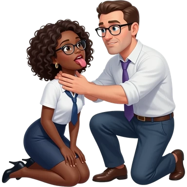 submissive midtone black woman kneeling down with white man's hand choking her with her tongue out with glasses and curly hair and librarian outfit emoji