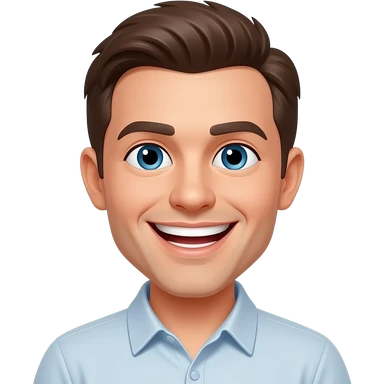vit 50-årig kvinna med jättelångt mörkbrunt hår med vita slingor bruna ögon ljusblå skjorta med översta knappen uppknäppt emoji